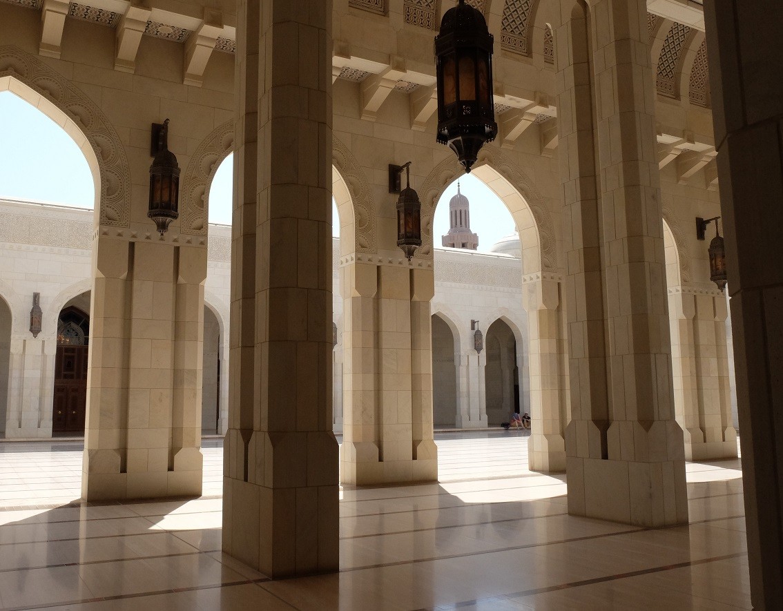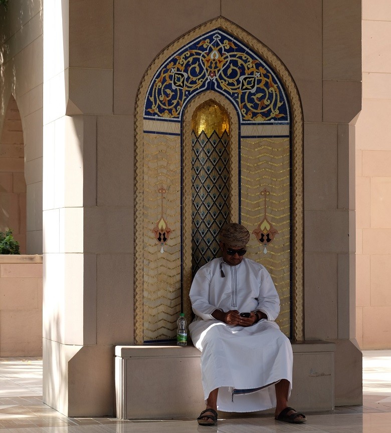 Die Reisegruppe zieht weiter im klimatisierten Bus mit der Wasserflasche an den Lippen zum Hafen von Mutrah. Dort machen wir einen Gang durch den Souk und bewundern die omanischen Männer in ihren weißen Dishdashas und den bunt bestickten Kummas auf dem Kopf und die osmanischen Frauen, allesamt in schwarzen langen Gewändern. Der Souk ist überdacht und windet sich leicht bergauf gehend in zahllosen Gässchen.