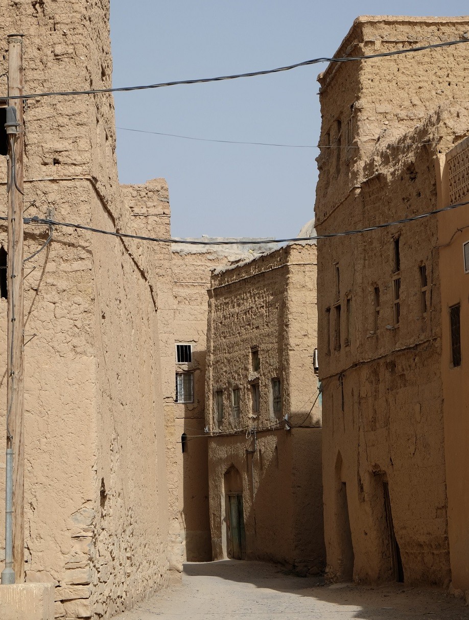 Nun setzt sich die Kolonne wieder in Bewegung … bald wieder auf Asphalt. Wir kaufen wieder für Mittag in einem Lulu Hypermarket ein und machen unsere Mittagspause im Vorhof des Palastes von Jabrin, den wir danach besichtigen. Das von außen trutzig bis abweisende Gebäude entpuppt sich innen drin als wunderbar anrührend. Eine vor Jahrhunderten erdachte Konstruktion spendet auch heute noch angenehmes kühlendes Raumklima mit Winden, die geschickt durch die intelligent gesetzten Fenster wehen. Die Wohn- und Schlafräume sind sparsam mit Teppichen und kunstvoll bemalten Holzdecken ausgestattet und verbreiten eine relaxte, attraktive Stimmung.