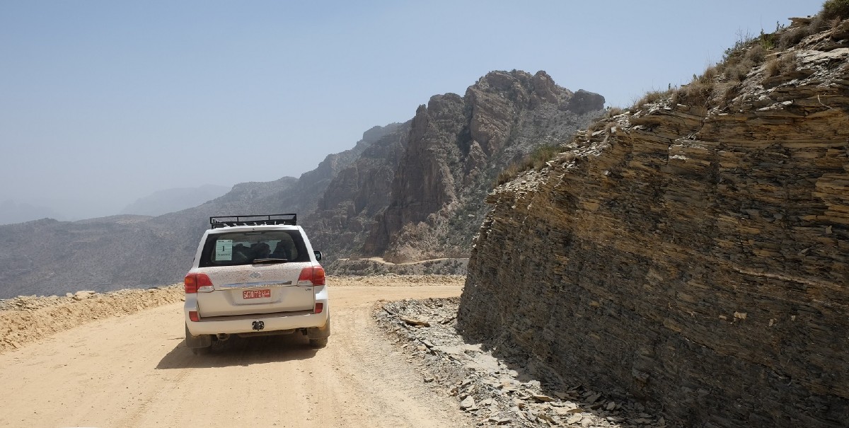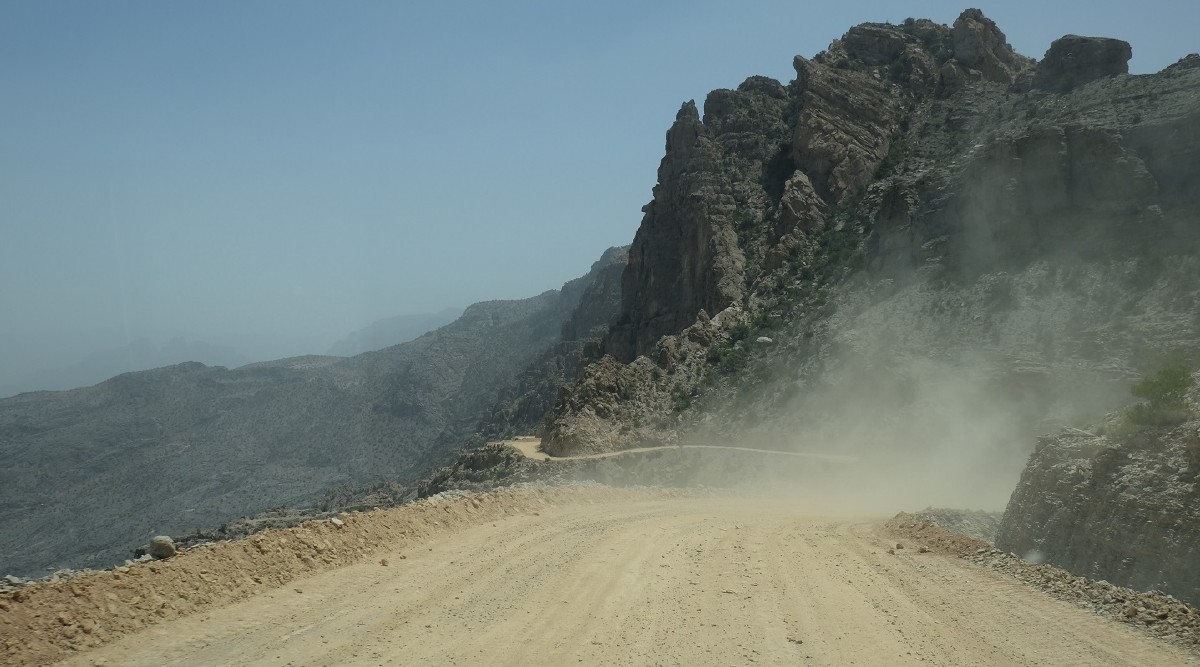 Die Weiterfahrt wird steiler, kurvenreicher und vor allen Dingen staubiger. Durch das wilde, schöne Bergmassiv des Wadi Bani Auf führt die Tour und eins ums andere Mal bricht sich ein „Ah!“, ein „Boah“ oder ein „Waaahnsinn!“ den Weg über unsere Lippen derweil Achmed den Wagen Steilauffahrten und Abwärtskurven, immer nahe am Abgrund entlang, gekonnt und elegant lenkt.